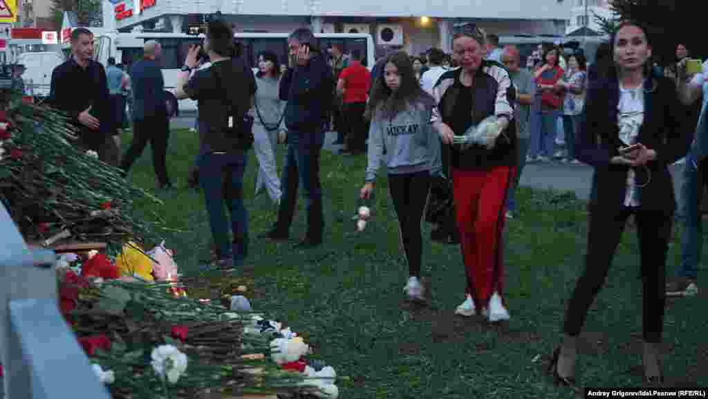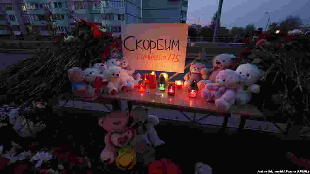 Казанцы до поздней ночи несли цветы, мягкие игрушки и свечи к школе, которая 11 мая подверглась атаке вооруженного ружьём 19-летнего парня. Уже в восемь вечера импровизированный мемориал утопал в цветах и плюшевых мишках. Он был организован на газоне наискосок от школы. К самому учебному заведению многочисленных казанцев не подпускала полиция.