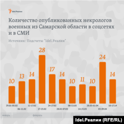 Однако только с конца января и до начала апреля таких некрологов было 165 штук (в среднем по 15 некрологов в неделю). Уже к 29 января "Idel.Реалии" смогли установить 88 имен мобилизованных из Самарской области, которые погибли в Макеевке.