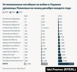 Согласно подсчетам "Idel.Реалии", Башкортостан занимает первое место в Поволжье (и в целом в России) по количеству подтвержденных потерь на войне с Украиной (с 24 февраля 2022 года). На конец декабря 2024 года редакция установила имена 4 048 погибших. На первое место по военным потерям в регионах Поволжья Башкортостан вышел еще к лету 2022 года.
