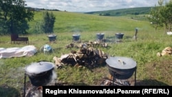 Пока мы беседовали с Галиной Тимербаевной, женщины разделали мясо быка на куски, промыли в родниковой воде, разложили по котлам. На ритуальном огне густой бульон закипает быстро. Здесь все делается степенно и очень чисто.