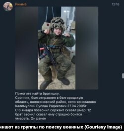 Руслану Калимуллин было 19 лет. 13 января этого года его сестра Римма опубликовала в соцсетях пост о его поиске: "Помогите найти братишку. Срочник, был отправлен в Белгородскую область, Волоконовский район, село Коновалово. Калимуллин Руслан Радикович 27.04.2005. Шестого января позвонил сержант, сказал, [что он] умер. Двенадцатого брат звонил, сказал, ему страшно, боится умереть. Он ранен".
